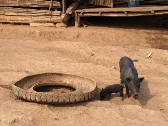 Luang Namtha ist eine Provinzhauptstadt unweit der Grenze zu China. Von hier aus kann man verschiedene Touren in umliegende Bergdoerfer und Nationalparks machen. Der Ort besteht hauptsaechlich aus Reisebueros, Guesthouses und Restaurants. Uns waren die angebotenen Touren zu teuer und der Ort zu touristisch und so sind wir am folgenden Tag auf eigene Faust weiter in den Norden nach Muang Sing gefahren. Die Strasse fuehrte durch eine Berglandschaft und war recht holprig. Es wurde zunehmend trockener und staubiger. Dort angekommen waren wir im ersten Moment etwas geschockt. Der Ort wirkte trostlos und nicht sehr einladend. Vom umliegenden, im Reisefuehrer wunderschoen beschriebenen Bergpanorama, war leider nichts zu sehen.Wie schon im Sueden Thailands brennen auch hier die Bergvoelker momentan ihre Felder ab. Die Kombination Staub und Feuer sorgt fuer eine sehr bescheidene Weitsicht und es regnet Asche. Nachmittags trafen wir zwei Deutsche wieder, mit denen wir im Bus angekommen waren und entschlossen uns, mit ihnen am naechsten Tag eine Wanderung durch verschiedene Bergdoerfer zu machen und dann am Nachmittag wieder zurueck nach Luang Namtha zu fahren.