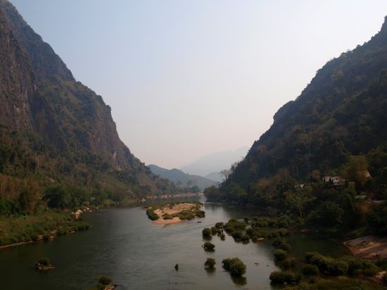 Am folgenden Morgen machten wir die staubigste Busfahrt unserer Weltreise. Wir verbrachten sieben Stunden in einem uralten Bus mit offenen Fenstern, der hauptsaechlich durch Baustellen oder auf Schotterstrassen fuhr. Zum ersten Mal seit Kambodscha haben wir wieder unsere Staubmasken getragen, um etwas besser atmen zu koennen. Reichlich verstaubt erreichten wir Nong Khiaw und waren sofort hellauf begeistert. Dieser kleine Umweg Richtung Luang Prabang war ein Volltreffer. Das Oertchen liegt am Fluss Nam Ou, in einer sehr idyllischen Landschaft. Es ist umgeben von hohen Sandsteinbergen und zum ersten Mal seit unser Ankunft in Laos war es nicht ganz so staubig und viel gruener als wir es erwartet hatten.