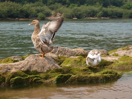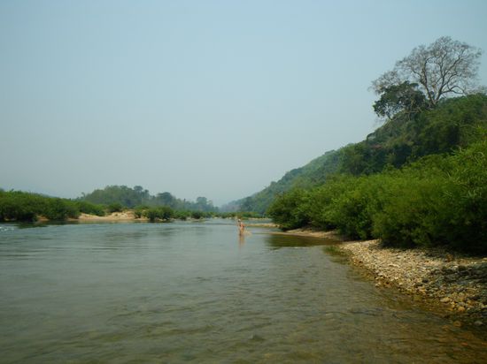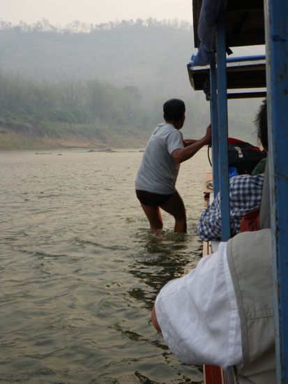 Eine weitere siebenstuendige Bootsfahrt fuehrte uns nach Luang Prabang. Diese kleine Flusskreuzfahrt gefiel uns sehr gut. Wesentlich angenehmer als Bus oder Minibus. Wir fuhren durch bezaubernde Landschaften und vorbei an unzaehligen Doerfern. Wir sahen die Einheimischen beim Fischen, Goldschuerfen, Schwimmen, Schlauchtauchen, Waschen und Kinder spielten im und am Fluss. Aufgrund des auch hier eher niedrigen Wasserstandes mussten wir einmal mitten im Fluss das Boot verlassen und es ein paar hundert Meter schieben. Wir waren begeistert, wie sicher uns ansonsten ein erfahrener Captain durch das meist nur etwas mehr als knietiefe Wasser mit vielen Stormschnellen navigierte.