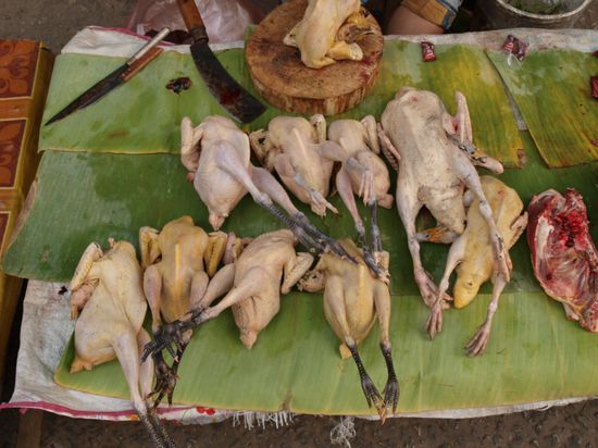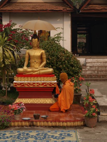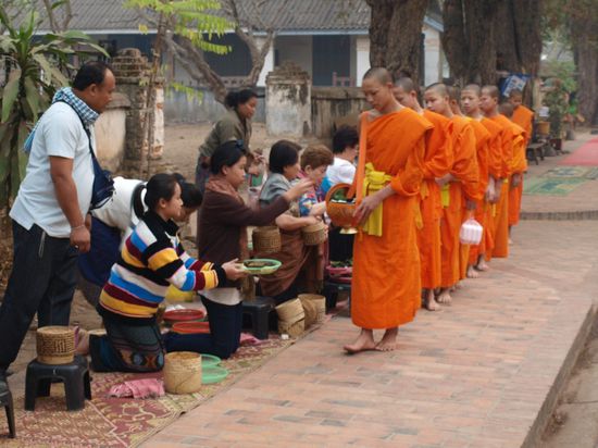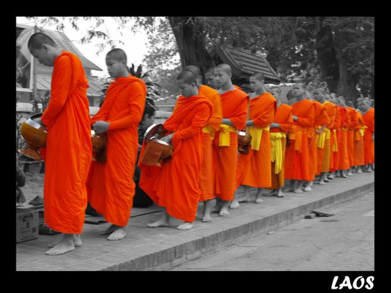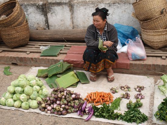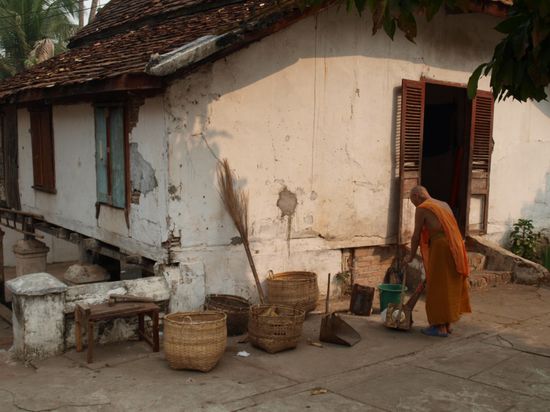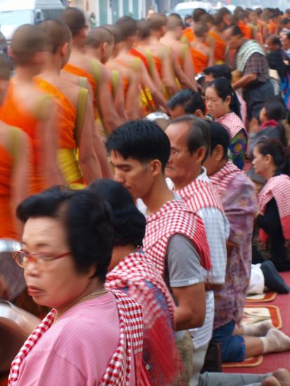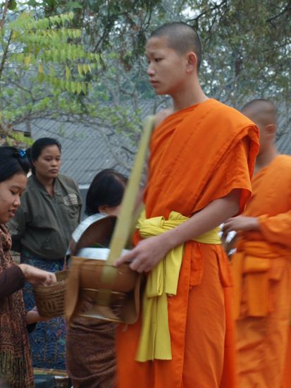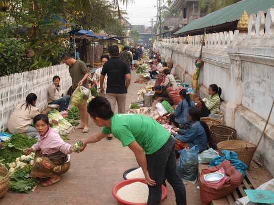 Tags darauf standen wir sehr frueh auf, um die allmorgendliche Prozession der Moenche zu sehen. Sie verlassen um kurz nach sechs ihre Kloester und sammeln Almosen (Nahrungsmittel) von der Bevoelkerung und Touristengruppen ein. Mehrere hundert Moenche passieren fuer eine gute halbe Stunde die Glaeubigen. Ein sehr friedlicher und entspannter Anblick. Anschliessend besuchten wir den jeden Morgen stattfindenden Markt.