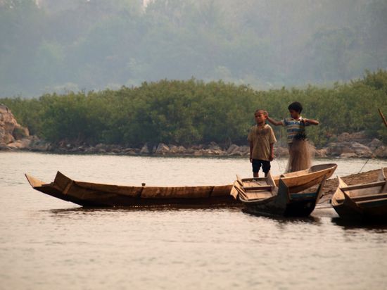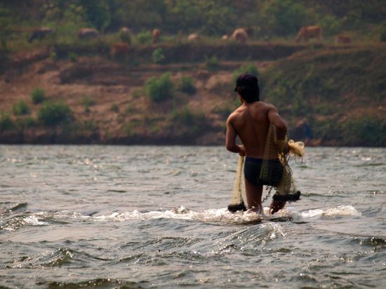 Am folgenden Tag fuhren wir mit einem Boot weiter den Fluss hinauf und lernten, wie man mit einem Wurfnetz fischt. Besser gesagt lernten wir, wie man das Netz wirft, da wir leider keinen einzigen Fisch gefangen haben. Unsere einzigen Beobachter waren eine kleine Herde Wasserbueffel, die unsere Anwesenheit in ihrem Territorium nicht weiter interessierte. Der Bootsfahrer hatte zum Glueck mehr Erfolg als wir und wir mussten nicht verhungern. An einem Sandstrand bereitete er uns die Fische ueber einem kleinen Feuer zu. Das leider erfolglose Fischen und die Zeit am Fluss hat uns sehr gut gefallen. Auf dem Rueckweg besuchten wir noch ein kleines laotisches Dorf und genossen einen wunderschoenen Sonnenuntergang vom Boot aus.
