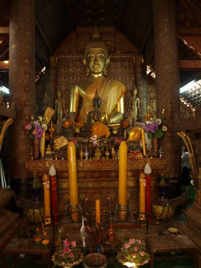 Wat In Paneng - wie viele andere laotische Temple ist er von Aussen mit Gemaelden von Buddha verziert. In Thailand findet man diese eher innerhalb der Tempel.