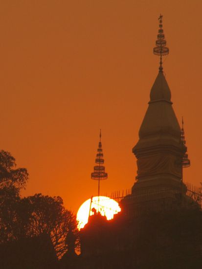 Nach unserer Ankunft fanden wir sehr schnell ein nettes Guesthouse etwas ausserhalb des historischen Zentrums. Am naechsten Morgen schlenderten wir durch die Altstadt, besuchten verschiedene Kloester und bewunderten die wunderschoenen Kolonialgebauede. Mittags besuchten wir unsere "Wanderfreunde". Leider wurde unser erster Eindruck hier durch viel zu viel Rauch eher vernebelt. Nachmittags stiegen wir auf den 100 Meter hohen Berg Phu Si im Stadtzentrum, auf dem mehrere kleinere Tempel und Buddhastatuen stehen und mussten aufgrund der miesen Sicht an unsere Zeit in Peking denken. Das der Smog hier organischer Natur ist, macht die Laune auch nicht besser. Nach einer Weile an der "frischen" Luft jucken die Augen und man fuehlt sich schlapp und muede.