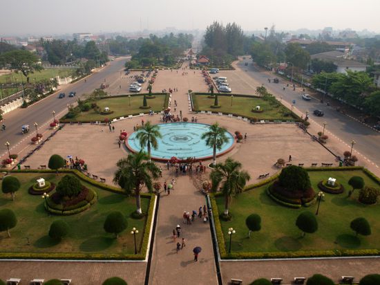 Ein Triumphbogen, fuer den die laotische Regierung Zement verwendete, der ihnen von den USA fuer ihren Flughafen geschenkt wurde.