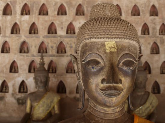 Vientiane ist seit 1975 die Hauptstadt der Demokratischen Volksrepublik Laos. Auf Lao heißt die Stadt "Stadt des Mondes" oder "Stadt des Sandelholzes". Vientiane ist das wirtschaftliche, politische und kulturelle Zentrum des Landes. Offiziell hat die Stadt etwa 350.000 Einwohner, im gesamten Ballungsraum leben etwa 620.000 Menschen. Somit ist es eine der kleinsten Hauptstaedte, die wir auf unserer Reise besuchten. Wir machten einen laengeren Spaziergang durch Vientiane und sahen uns verschiedene Sehenswuerdigkeiten an. Neben Tempel kann man sich einen Triumphbogen, lokale Maerkte, Museen und die Uferpromenade am Mekong ansehen. Letztere ist im Moment eher zu vernachlaessigen, da man aufgrund der bereits erwaehnten Probleme Wasser nur erahnen kann.