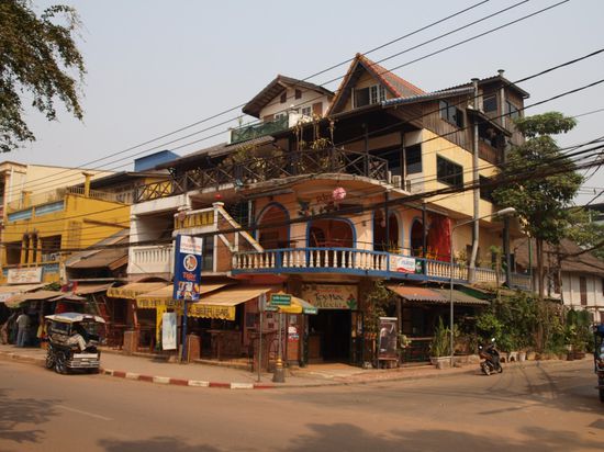 Nach einer zehnstuendigen Busfahrt kamen wir in Vientiane an und unser erster Eindruck war positiv. Wir fanden sofort ein sehr schoenes Guesthouse inmitten von Cafes und Restaurants im Zentrum.