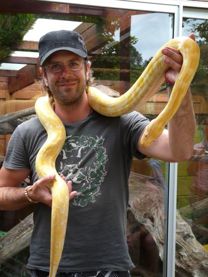 Am Tag nach der Wanderung waren wir auf einer Schlangenfarm. Wir hatten einen sehr guten Fuehrer und haben sehr viel ueber suedafrikanische Schlangen und Schlangen im Allgemeinen erfahren. Highlight der Fuehrung war es, dass wir uns Wuergeschlangen umhaengen durften. Fuer Joerg hat sich damit ein grosser Traum erfuellt. Anschliessend haben wir noch den Ort und die Nachbarstraende erkundet. Abends wollten wir theoretisch frueh ins Bett und am naechsten Tag auf einer Halbinsel wandern. Praktisch haben wir mit den Einheimischen die Nacht zum Tag und eine Kneipentour durch Plettenberg gemacht. Wir haben viel zu viel getrunken!!! Dementsprechend musste die geplante Wanderung leider wegem akuten Unwohlsein gestrichen werden. Wir haben bis zum Nachmittag den Schatten gesucht und anschliessend einen kleinen Ausflug zum Strand gemacht. Das kuehlende Bad im Meer hat den Kopf wieder klar gemacht. Haette aber auch ganz schoen in die Hose gehen koennen, da am naechsten Tag ein Schwimmer von einem Hai gebissen wurde.