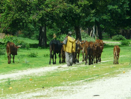Schweren Herzens und mit einem dicken Kopf sind wir dann Richtung Rundu abgefahren. Wir sind am letzten Abend mit Mike aus Windhoek und Marc ein wenig an der Theke versackt. Rundu liegt an der Grenze zu Angola, am Okavango und im wahren Afrika. Nachdem wir die rote Linie passiert haben aenderte sich das Umfeld schlagartig. Dieser Zaun wurde zum Schutz vor Viehkrankheiten vor mehr als 100 Jahren errichtet und anschliessend von den Deutschen und den Suedafrikanern zur Trennung von schwarzen und weissen Einwohnern genutzt. Heute ist sie eigentlich nur noch ein Relikt vergangener Zeiten. Sobald man den Zaun passiert hat sieht man am Strassenrand nur noch Huetten und grasende Rinder und Ziegen. Die Einheimschen und die Tiere leben direkt an und auf der Strasse. Mehrmals mussten wir heftig bremsen um Zusammenstoesse zu vermeiden. Rundu ist eine quirliege afrikanische Stadt. Es ist laut, voll und farbenfroh. Die Strasse sind nicht mehr geteert, sondern Sandpisten. Gecampt haben wir in der Nkwasi Lodge direct am Okavango. Leider war das Wetter schlecht, viel Regen. Das Campen unter den Bauemen und die Aussicht auf den Fluss und Angola haben wir aber sehr genossen. Zum Glueck wurde unser Zelt nicht geflutet, der Autovermieter hat uns bei Regen das Schlafen auf den Vordersitzen empfohlen. Leider hat hier die Regenzeit frueher als erwartet eingesetzt, was die Landschaft aber gruener und viel schoener macht.