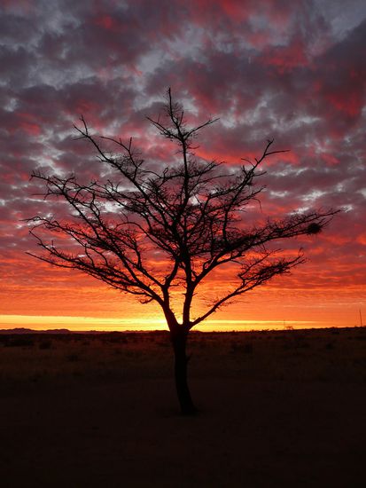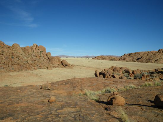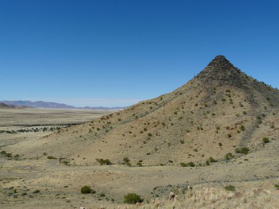 Nach einem Fruehstueck am Hikers Point mit zwei sehr netten Suedafrikanern aus der Naehe von Johannesburg sind wir zum Brukkaros Crater gefahren. Dort gibt es einen sehr einfachen Campingplatz mit toller Aussicht. Wir hatten weder Strom noch Wasser, dafuer aber ein Plumpsklo und die totale Einsamkeit in Mitten der unberuehrten Natur. Der Brukkaros ist ein Explosionsschlot mit einem Durchmesser von 3 km. Er ist ca. 1586 m hoch und liegt 550 m ueber der Ebene. Er ist nicht durch einen Vulkanausbruch entstanden. Vor 80 Millionen Jahren hat das Erdinnere nach dem Auseinanderbrechen des Urkontinents Gondwana gebrodelt und