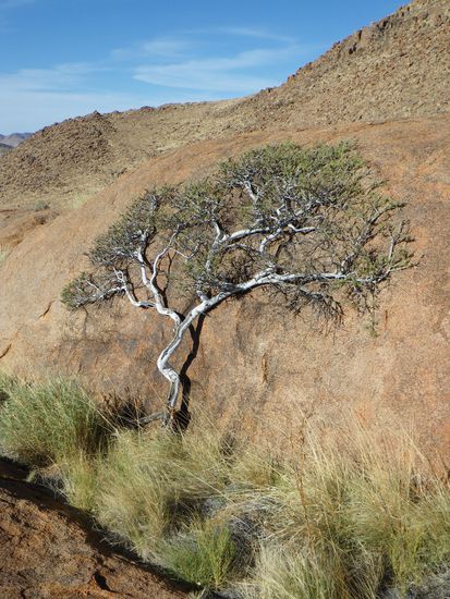 absoluter Geheimtipp. Die Koecherbaume wachsen noch und liegen in einer wunderschoenen Umgebung. Koecherbaueme sind perfekt auf die trockene Umgebung eingestellt. Die Rinde ist sehr hart und von einer Art Puder bedeckt. Im Inneren hat der Baum sehr feine Straenge, in denen er Wasser sehr lange speichern kann. Sie werden 200 - 300 Jahre alt und koennnen bis zu 7 m hoch werden. Der Name Koecherbaum stammt daher, dass die Buschmaenner frueher aus den
