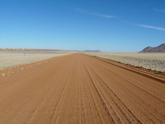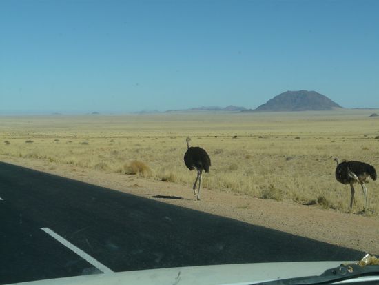 Am naechsten Morgen konnten wir dann wider erwarten ausschlafen. Unser Glueck vom Vortag wurde noch dadurch komplettiert, dass es wolkig war und wir in den Duenen laengst nicht so tolle Bilder haetten machen koennen. Spaeter sind wir ueber die D707 (die Traumstrasse Namibias) nach Koiimasis gefahren. Die Route war unvergleichlich. Auf der einen Seite die orangenen Duenen der Namib, auf der der anderen Berge, dazwischen schier endlose Weite. Der Boden ist hier mit kleinen silbernen und gelben Buesche bedeckt. Am Strassenrand standen zahllose Strausse, Springboecke und Oryx. Koiimasis ist ein Geheimtipp und in keinem