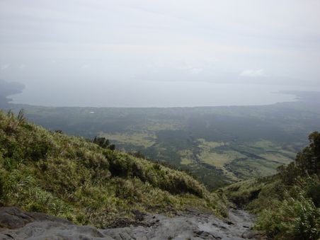 Wir machten ca. 30 Minuten Pause, staerkten uns mit ein paar Bananen, Chips, Biscuits und Schokolade und genossen den jetzt schon wirklich atemberaubenden Anblick auf den Vulkan und natuerlich auch in's Tal.