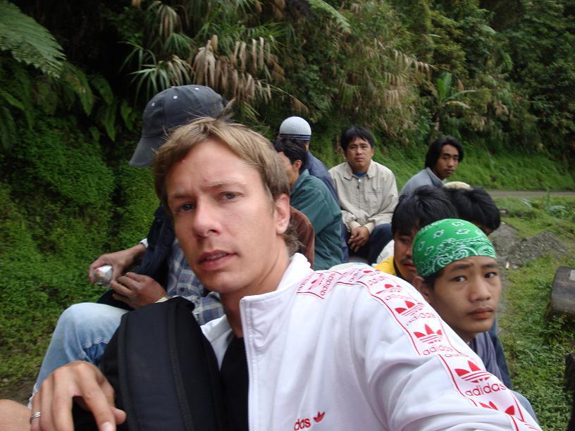 Kurz darauf stoppte der Jeepney vor mir, und die Leute auf dem Dach fragten mich ob ich auch noch mitfahren moechte. Klar, wenn ich irgendwie Platz finden wuerde, ich reichte ihnen meinen Rucksack hoch und kletterte auf's Dach... nun waren wir 16 Leute, aleine auf dem Dach und ich war natuerlich der Einzige Tourist ! Echt ein cooles Erlebnis... waehrend der Fahrt wurden wir diverse male von Touristen am Strassenrand fotografiert und ich inmitten der "Locals"!