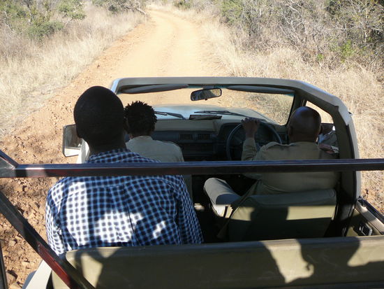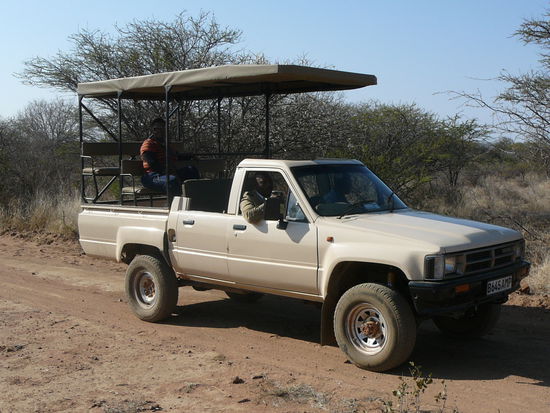 So fahren wir zu Fünft los. Neben Beauty und mir sind das unser Fahrer, ein Auszubildender und ein echter Buschmann, wegen der Fährtensuche.