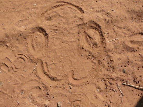 Um dem Ganzen einen Anstrich von Abenteuer zu geben lädt er sein Gewehr. Rhinos können gefährlich werden, wie er mit ernster Miene verkündet, und schultert seinen Schießprügel. Das Gebüsch und Gestrüpp, das aus dem Jeep heraus so harmlos aussieht, entpuppt sich als ziemlich unangenehm und ist voller Dornen, Stachel und Pflanzen, die an der Kleidung kleben bleiben. Unser Buschmann gibt sein Bestes. Auf dem meist harten Untergrund sind die Spuren der Nashörner nicht leicht zu verfolgen. Oft macht er kehrt und sucht woanders weiter, wir immer brav hinterher.