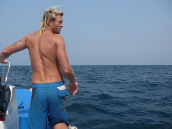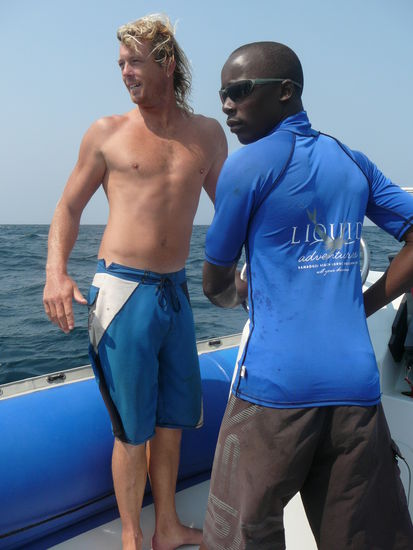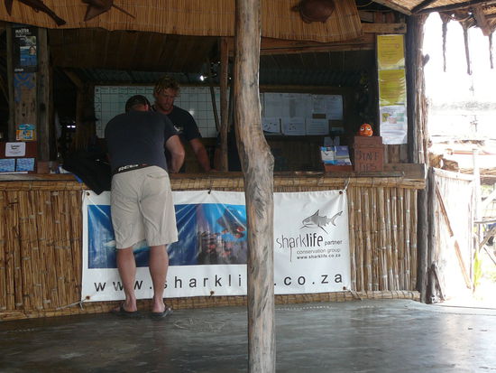 Wir sind insgesamt zu sechst, außer mir alles passionierte Taucher mit eigener Ausrüstung. Ich streife zum ersten Mal in meinem Leben einen Neopren-Anzug über, denn bei längerem Aufenthalt im Wasser könnte es kühl werden, probiere Flossen, Tauchermaske und Schnorchel. Dann werden wir gebrieft von Andrew, einem der südafrikanischen Inhaber der Tauchschule. Wie wir uns verhalten sollen, auf dem Boot und im Wasser, wenn wir Walhaie sehen und evtl. Delfine. Wird anstrengend bei den Wellen, meint er. Na dann, ich bin etwas besorgt. Wasser ist eigentlich nicht so mein Ding. Ich fühle mich immer etwas unwohl wenn ich nicht weiß was unter mir vorgeht. Und ich bin mir sicher, da draußen im Ozean wird eine Menge los sein unter mir.