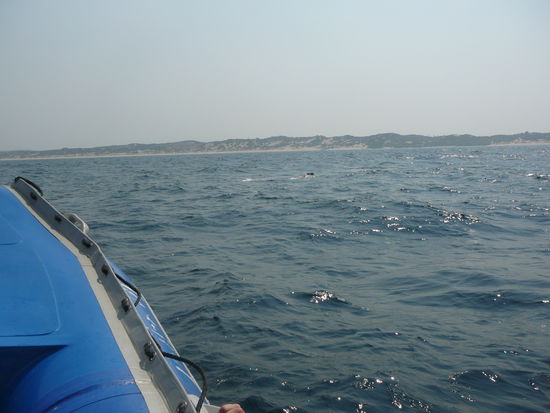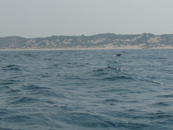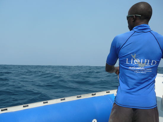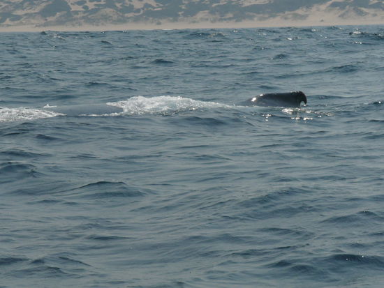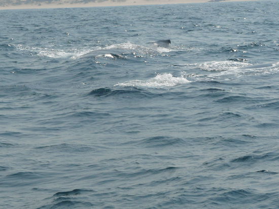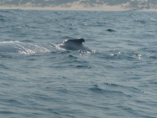 Nach den Walhaien kommen die Buckelwale dran. Die ziehen in dieser Jahreszeit an der mosambikanischen Küste entlang Richtung Antarktis zu ihren Laichgründen. Sie schwimmen weiter draußen auf dem Meer und sind zunächst nicht leicht zu entdecken. Manchmal sehen wir eine Schwanzflosse aus dem Meer ragen und abtauchen. Dann ist es zu spät. Buckelwale können bis 10 Minuten unter Wasser bleiben. Schließlich gelingt es uns doch an den einen oder anderen, der gerade an der Oberfläche ist, näher heran zu kommen, besonders nah an eine Mutter mit ihrem Kleinen, ca. 8 bis 10 Meter. Ins Wasser sollen wir nicht. Will ich auch gar nicht. Die Tiere sehen gewaltig aus.