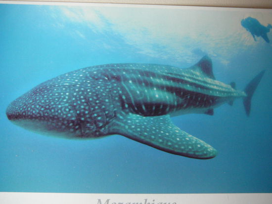 Walhaie sind sehr neugierige Tiere und schwimmen drauf zu, so dass wir uns nur ins Wasser fallen lassen müssen und warten bis sie vor uns aufkreuzen. Walhaie können bis zu 18 Meter lang werden. Unsere Exemplare sind kürzer, aber immer noch riesig, 6 bis 10 Meter etwa. Die Sicht unter Wasser ist nicht so gut durch die aufgewühlte See, und so erschrecke ich mich fast jedes Mal wenn ein Walhai plötzlich vor mir auftaucht. Er gleitet lautlos, elegant und majestätisch unter mir durch und ich versuche hinter ihm her zu schnorcheln, was auch oft gelingt, da Walhaie relativ langsam sind. Wenn ich ihn dann doch verliere und zum Boot schaue sehe ich schon Andrew winken und in eine Richtung zeigen. Da kommt schon der Nächste. Anfassen könnte man sie natürlich auch. Sollen wir aber nicht, bat uns Andrew vorher. Ich habe nicht ganz verstanden warum. Ich glaube ihre Haut würde Schaden nehmen. Zur Erinnerung an die Walhaie muss eine schlichte Ansichtskarte genügen. Auch wenn man sie, im Boot stehend, deutlich nahe unter der Wasseroberfläche sehen kann, auf den Fotos ist nur das Wasser des Indischen Ozeans zu sehen.