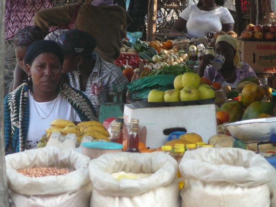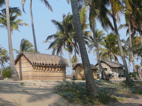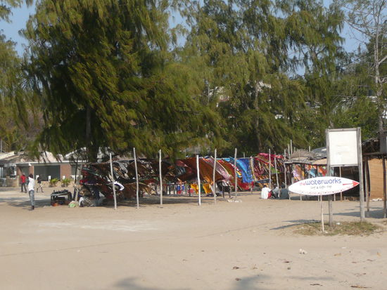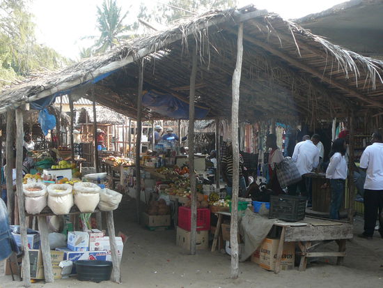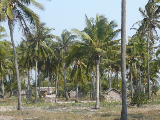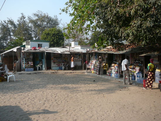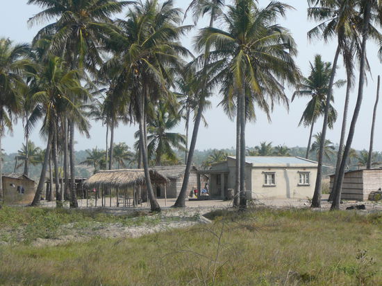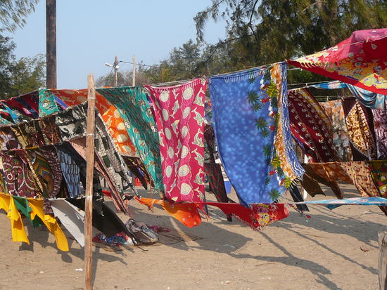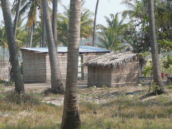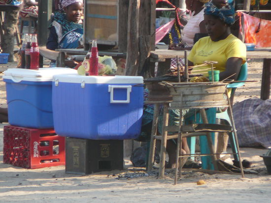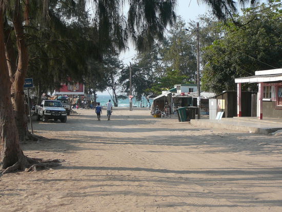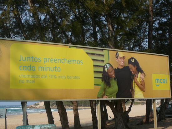 Zweieinhalb Stunden später und um 1.500 Meticais, gut 40 Euro ärmer, ziemlich kaputt, dafür aber sehr zufrieden gehe ich zu meinem Chalet zurück. Ausruhen ist aber nicht. Ich starte zu einer nachmittäglichen Fotosafari, gehe auf dem Sandweg durch den Palmenhain vor unserer Lodge mit ein paar sehr primitiven Strohhütten zum Ort, kaufe mir bei einer Marktfrau eine kalte Cola und habe wieder Mitleid mit ihr angesichts der technomäßigen Dauerbeschallung. Zwischen Markt und Strand ist ein riesiges Werbeplakat aufgestellt. Klar, von Mcel. Mcel ist überall.