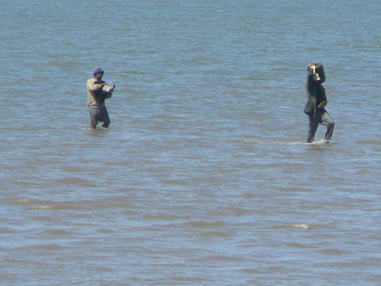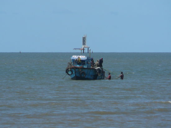 Ich laufe am Strand entlang. Es herrscht nun am frühen Samstag Nachmittag reger Betrieb. Überwiegend junge Leute gehen spazieren, Frauen und kleine Kinder graben im nassen Sand -vermutlich- nach Krebsen oder anderem Getier, das sie entweder selbst verzehren oder verkaufen können. Fischer stehen hüfttief mit ihren Angeln im Wasser. Etwas weiter entfernt, auf Höhe des Dorfes liegt eine kleine Fähre, aber weit vor dem Strand. Eine Anlegestelle gibt es dort nicht. So müssen die Passagiere, ihr Gepäck auf dem Kopf balancierend, bis zur Brust durchs Wasser waten, um das Schiff zu erreichen.