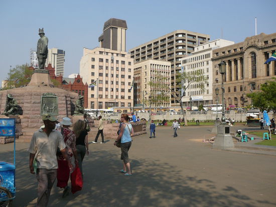 machen eine Stadtrundfahrt und steigen schließlich am Church Square, dem zentralen Platz der Stadt mit vielen historischen Gebäuden, aus. Wenn man aus Johannesburg kommt wirkt Pretoria richtig provinziell, überschaubar, viel relaxter. Es gibt hier richtig schöne Ecken.