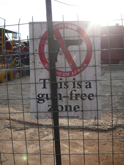 Selbst im bescheidensten Heim gibt es offensichtlich noch etwas zu holen. Der Kindergarten ist laut Schild am Eingang nur unbewaffnet zu betreten.