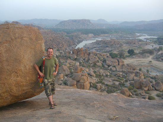 Am Dienstag gings fuer mich um 6 Uhr morgens aus den Federn, da ich den Sonnenaufgang ueber Hampi geniessen wollte. Bin die Manthanga Hills hinaufgekrakselt und Leute ein Wahnsinn. Zusammen mit ungefaehr 30 Affen hatte ich einen sensationellen Sunrise. Dieses Licht und diese steinige Landschaft in desem Moment waren atemberaubend schoen.