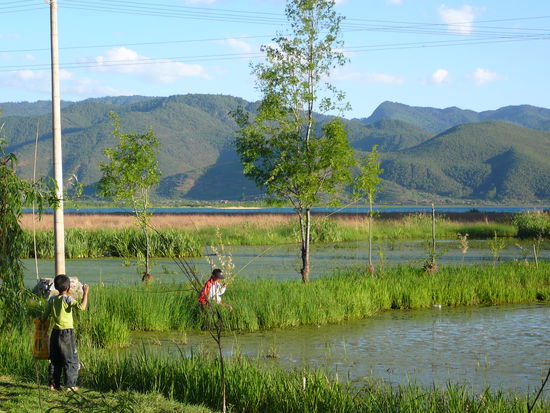 Mein Gaestehaus liegt an einem Platz, der noch relativ unerschlossen ist, wobei aber auch hier schon einige Gaestehaeuser sind. Es liegt an der "Grasland-Bucht", die die Westseite des Sees bildet. Ein riesiges Gebiet ist voll mit Wassergras, quakenden Froeschen, zirpenden Grillen, Entenfamilien und Gaensen und abends natuerlich auch mit Muecken Man kann den Maennern zusehen, die mit den Kanus fahren und das Gras schneiden. Dieses Gras wird dann von Pferden und Eseln in die Doerfer transportiert, um die Tiere damit zu fuettern und sonstige Dinge herzustellen. Es sieht alles so friedlich aus, wie in einer Maerchenwelt.