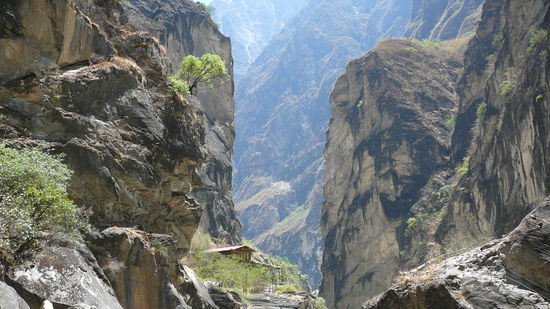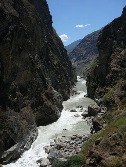 Als wir mit dem Bus u ca. 10:00 wieder bei der Schlucht angekommen waren, entschieden wir uns, natuerlich auch bis ganz auf ihren Grund zu gehen, also zum durch sie hindurchfliessenden Fluss. Und das hat sich gelohnt! Ohne dies waere die Tigersprungschlucht zwar auch schoen in meiner Erinnerung geblieben, aber dort unten ueberkam uns drei ein Schauer vor Ehrfurcht gegenueber dieser Schoenheit und dieser Power des Wassers, dass sich ueber Jahrtausende seinen Weg durch diese Schlucht geformt hatte. Seht selbst!
