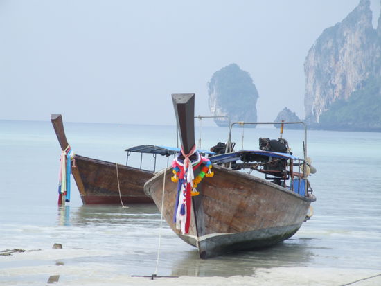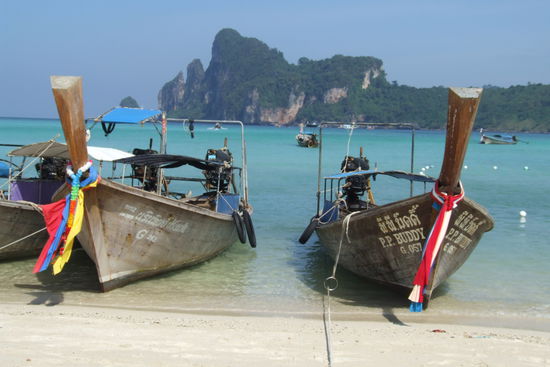 Die Phi Phi Inseln - tropische Traumeilande im warmen indischen Ozean, atemberaubend schoen. Nach Ankunft habe ich die Szenerie in einem atemberaubend einfachen Strandpub aufgenommen. Boote, atemberaubende schoene Landschaften. Die Phi Phi Inseln, trotz moderaten Tourismus, auch das hat seine Vorteile, man findet auf jeden Fall Filter Kaffee auf den Phi Phi Inseln und genuegend Guest Haeuser, sind die Phi Phi Inseln eine der Trauminseln der Welt.
