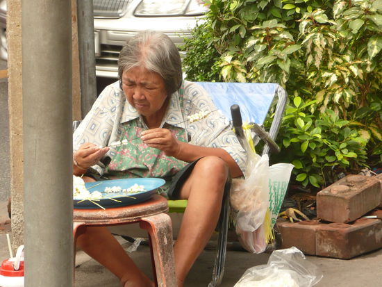 Weiter ging es vorbei an einem Schrein. Die Thais legen dort ihre Opfergaben ab. Die gibt es natuerlich an der Strasse vor dem Schrein. Ein Stand neben dem anderen.