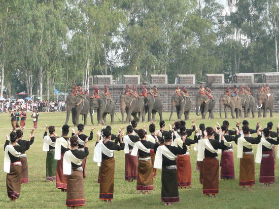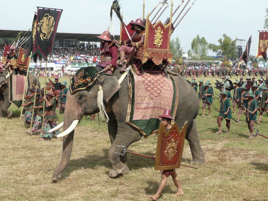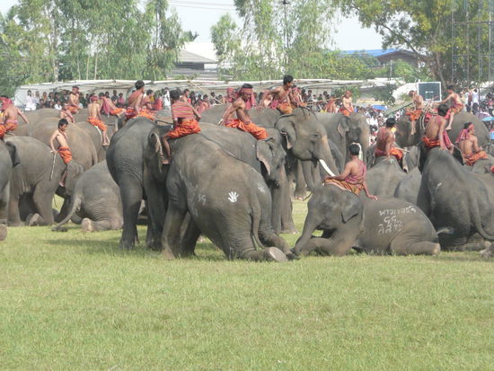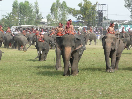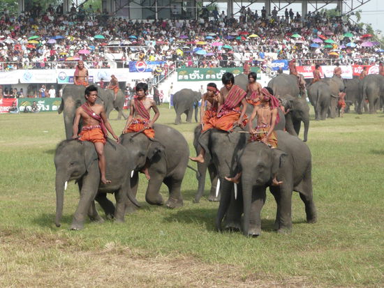 Ich werde gleich noch mehr Bilder einstellen. Das Festival hat um 8 Uhr morgens angefangen und an diesem Tag geht es im Stadion von Surin bis 11 Uhr. Empfehlen kann ich die Tribuene fuer 500 Baht. Ueberdacht ist es ganz gut auszuhalten. Man sollte darauf achten, das man eine hohe Sitznummer bekommt. Ab 70 ist ganz gut.