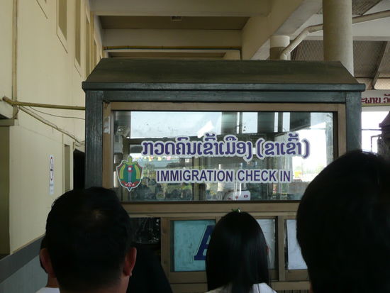 Das Tuk-Tuk hat 40 Baht gekostet und dann durch die Passkontrolle. Nochmal 10 Baht Fee fuer den Eintritt nach Laos. Dann ein Busticket fuer 25 Baht fuer ueber die Bruecke. Man muss als Auslaender mit einem Fahrzeug ueber die Bruecke.
