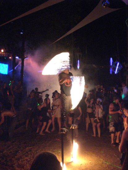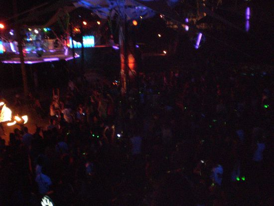 Nach langer Feierpause, mussten wir dann doch die Fullmoonparty in abgewandelter Form mal erlebt haben. Um es kurz zu machen> Fullmoon heisst auf dieser Party Halfmoon, man baue einen Feierpalast unter freiem Himmel in ein abelegenes Waldstueckchen auf der Insel, beleuchte alles mit Neonlicht und fluoreszierender Farbe und haenge eine Leinwand mit psychodelischen Filmchen auf. Jetzt packe man noch knapp 5.000 Menschen in die Mitte des Tempels, nen paar Feuerspucker und Artisten dabei und verruehre die ganze Suppe mit 230 bpm, extremst lauter Technomusik...dat iss Halfmoonparty. Eine schauderhafte Schoenheit, die man einmal gesehen/erlebt haben muss...aber nicht nochmal!