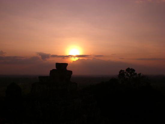 Am naechsten Morgen gings dann um neun Uhr los zu den Tempelanlagen von Angkor. Als ersten stand der groesste und bekannteste Tempel auf dem Plan: Angkor Wat. Die quadratische Aussenmauer umschliesst ein 3 qm grosses Areal, in dessen Mitte der Tempel liegt, welcher recht gut erhalten ist, bzw. gut restauriert wurde. Nahezu alle Waende sind bedeckt mit Reliefs, die Motive der hinduistischen Sagenwelt zeigen, sehr schoen und beeindruckend. Danach gings zur Tempelanlage Angkor Thom, von deren Tempeln der Bayon der groesste und schoenste ist. Man koennte Seiten mit Beschreibungen der verscchiedenen Tempel und ihrer Geschichte fuellen, was ja auch getan wurde, also lassen wir das an dieser Stelle mal. Nach einigen weiteren Tempeln und Palastanlagen gings dann auf einen Berg, um sich den Sonnenuntergang anzuschauen, was nicht ganz einfach ob der Massen an Touristen.