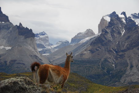 Der Reisefuehrer spricht von Guanakos, auf die man ueberall im Park trifft. Ausser einem Warnschild hatte ich an den ersten beiden Tagen im Nationalpark nicht ein einziges gesehen. Ich habe den Eindruck, diese Schilder werden nur fuer die Touristen aufgestellt, damit sie die Tiere, deretwegen sie ja auch kommen, zumindest auf diese Art zu Gesicht bekommen. Dann allerdings auf dem Weg aus dem Park ein einzelnes Guanako, noch dazu perfekt vor der Kulisse der Berge. Eine ganze Reihe von Bildern kann ich aus naechster Naehe machen. Und ueber der Szene kreisen vier Kondore - Andenpanorama vom allerfeinsten.