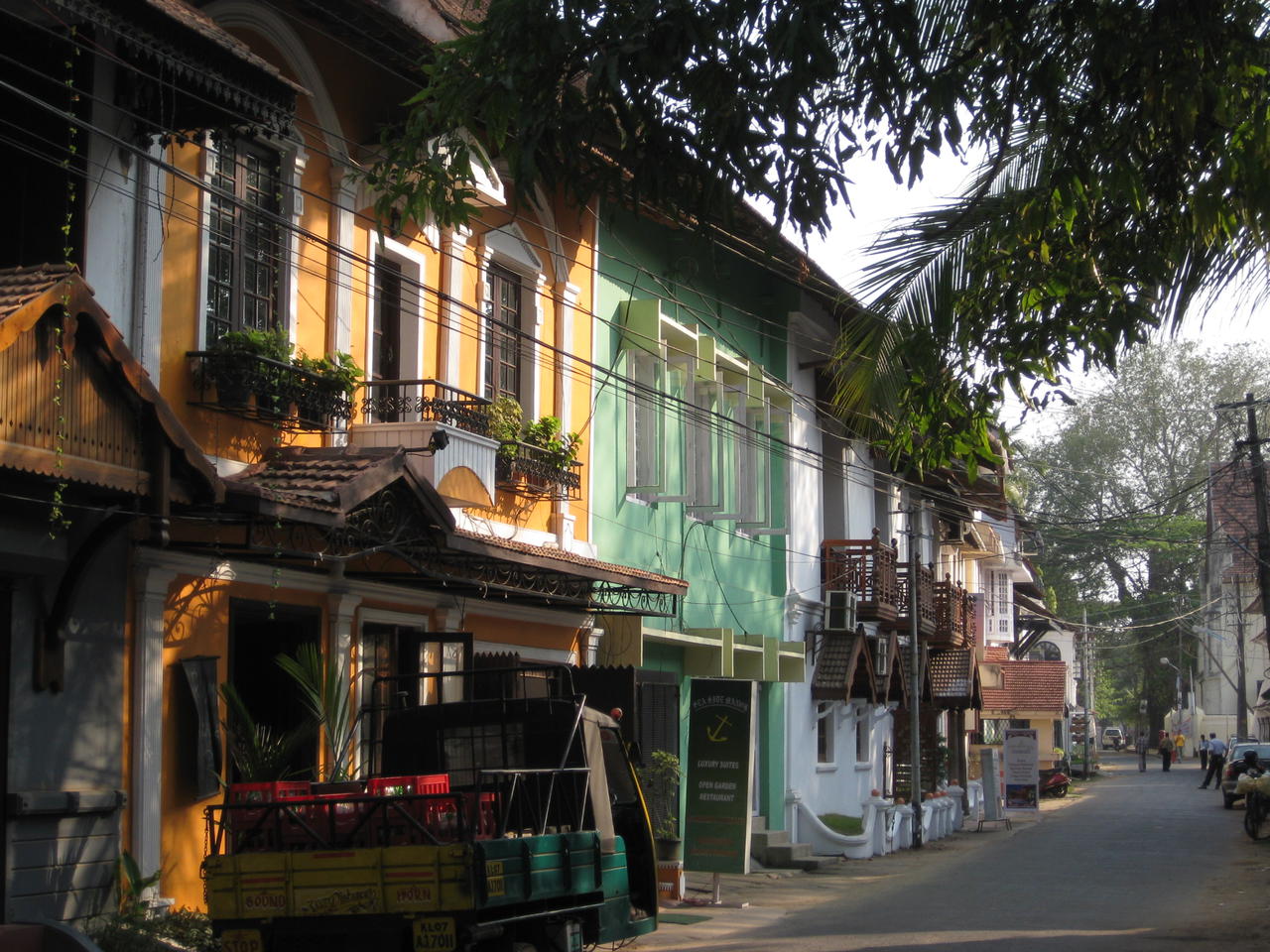 Nach unserem Aufenhalt im Landesinneren zog es uns doch wieder zurueck an die Kueste, wo wir erstmal in Kochin haltmachen. Das kleine Stadtchen liegt auf einer Insel direkt vor der hektischen, normal indischen, Stadt Ernakulam. Nach Kochin kommen wir, wie auch sonst, nur mit der Faehre. Dort angekommen fuehlen wir uns wie in einer anderen Welt. Die Gebaeude und kleinen Strassen erinnern eher an ein verschlafenes Mittelmeerstaedchen als an den Teil einer indischen Millionenstadt. Deutlicher koennte der Unterschied kaum sein, sauber, ruhig und total westlich angehaucht. Der grosse Unterschied wird wohl daher kommen das Kochin seit Jahrhunderten von quasi allen ehemaligen grossen Seefahrernationen besetzt war, welche natuerlich ueberall ihre Spuren hinterlassen haben, und das nicht nur in architektonischer Hinsicht.