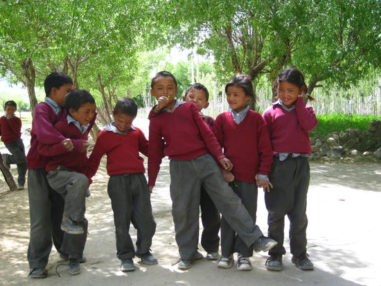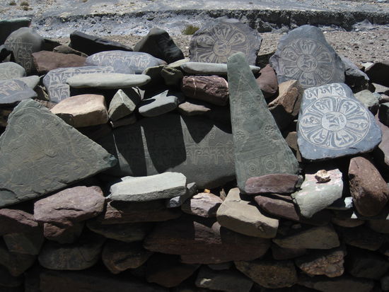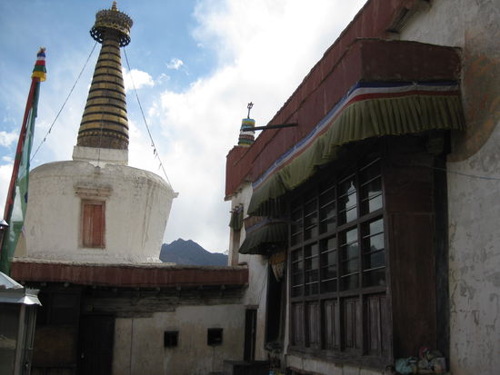 Ueberall in umd um Leh kann man den buddhistischen Einfluss aus Tibet und die gemeinsamme Vergangenheit bestens sehen. In der ganzen Stadt und auch mitten in der Landschaft stehen Gebetswaende mit Mani Steinen, Gebetsmuehlen und unzaehlige neue oder halbverfallende Stupas. Auf den meisten markanten Landmarken stehen Gompas. Alle sind noch aktiv und so sieht man ueberall auf den Strassen tibetianische Moenche und Novizen.