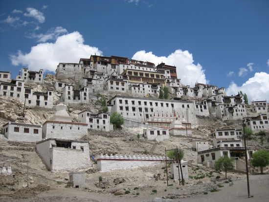 Ganz in der Naehe von Leh liegt Thiksey. Hier befindet sich ein grosser Klosterkomplex in dem an die hundert Moenche leben und lehren. Die ganze Anlage zieht sich auf der sonnenseite eines steilen Huegels hinauf. Oben auf dem Gipfel stehen die Heiligtuemer und die Wohnstaetten der Moenche liegen darunter. Ein eindrucksvoller Ort mit wunderschoenen Tempeln, von deren Dach wir einen tollen Ausblick ueber das hier breite und gruene Tal des Indus haben.