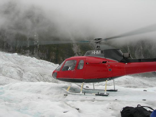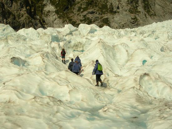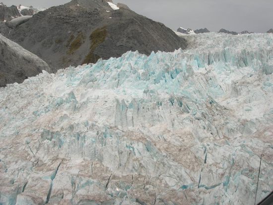 Ich habe den Gletscher selbstverstaendlich auch besucht, aber natuerlich bin ich nicht zu fuss hoch, sondern habe es vorgezogen mit dem Helikopter rauf zu fliegen, ein wenig uebers eis zu wandern und dann wieder runter geflogen zu werden. Mit dem Heli hat man auch die moeglichkeit weit auf das Gletschereis zu kommen, wobei man ohne eine gefuehrte wanderung 200m vorher stehen bleiben muss. Das heli fliegen war super, genauso hatte ich es mir vorgestellt und wenn ich mal gross bin werde ich heli-pilot. Der gletscher bzw das eis war wirklich beeindruckend und es hat viel spass gemacht dort herumzulaufen (natuerlich nicht ohne crampers an den boots) und in eine eishoehle zu kraxeln, schon enorm was die natur dort geschaffen hat. Das der gletscher staendig in bewegung ist konnte man auch miterleben, denn zwei mal ist vom steilhang ein riesen brocken abgebrochen und dann mit einem unglaublichen furchterregenden krach hinabgestuerzt.