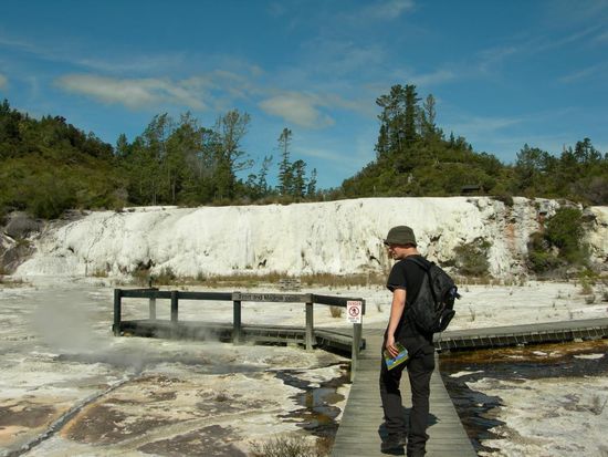Nach 2 Tagen Auckland waren wir beide froh dort rauszukommen und die Grossstadt hinter uns zu lassen. Mit unserem gemieteten kleinen Auto ging es Richtung Sueden - in die Mitte des Landes - nach Rotorua. Eine der aktivsten Thermalgegenden Neuseeland, was man auch beim erstem Atemzug ausserhalb des Autos deutlich zu riechen bekommt. Wenn man sich erst mal an den faulen Eier geruch gewoehnt hat kann man sich in aller Ruhe die brodelden Schlammloecher und dampfenden Quellen im Stadtpark anschauen.
