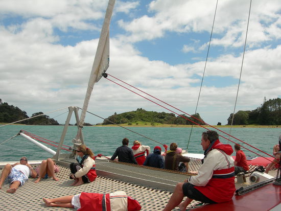 Das haben wir dirket mal ausgenutzt und uns einen Segeltrip auf einem super schnellen Segelboot gebucht. Es gab ein Barbeque und ein Zwischenstopp in einer kleinen Bucht, wo man Schnorcheln, Kajakfahren oder auf einem Reifen vom Motorboot gezogen werden konnte. Ich hab natuerlich nix von alledem gemacht da es trotz Sonne ziemlich kalt war, da die ganze Zeit eine steife Briese herrschte.