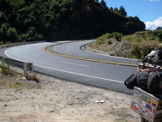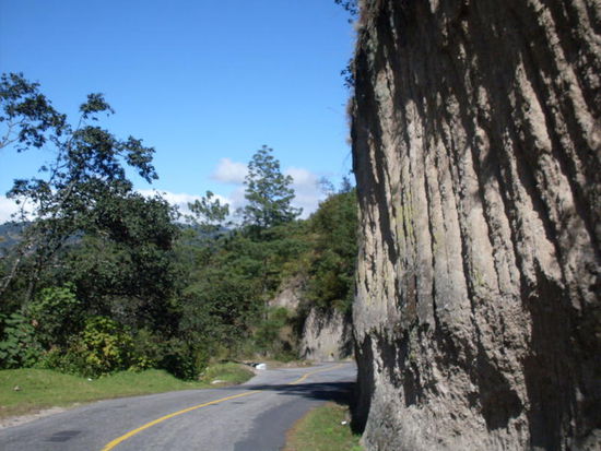 Der Asphalt hat Löcher aber das ist immer noch besser als das was ich hinter mir habe. Da die Straße unterhalb des Vulkan führt ist es sehr windig und turbulent. Das Moped eiert und ich denke das Bike hat was abbekommen beim Umfaller und ich kontrolliere Reifen und Rahmen aber nichts zu finden. Komischer weise ist an den Bäumen wenig Wind zu sehen. Dann komme ich auf die Panamericana. Perfekter Asphalt und zweispurig. Ich lasse die Mühle fliegen und sie liegt gewohnt ruhig. War wohl doch der Wind und die holprige Straße.