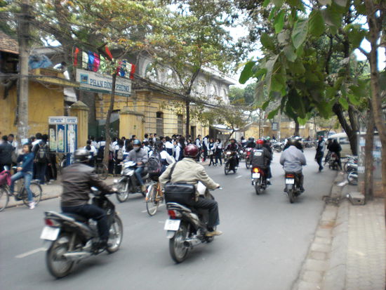Nach einem 4 Stunden Air Asia Flug mit einer Schulklasse von nervigen Vietnamesinnen an Bord sind wir nach 45 Stunden Reise oder so endlich in Hanoi angekommen!! Haben wieder ein bisschen um den Preis fuer Taxi handeln muessen und dann gings los in die Stadt ( der Flughafen liegt auch wieder ausserhalb von Hanoi City ) ... und das erste was einem auffaellt ist der Verkehr!!! Der ist hier im wahrsten Sinne des Wortes moerderisch, richtige Verkehrsregeln gibts hier keine, es gilt das Recht des Staerkeren! Unser Taxifahrer hatte seine Hupe im Dauereinsatz ( wie jeder Verkehrsteilnehmer hier ) und hat sich seinen Weg halsbrecherisch durch die Massen von Mopeds gebahnt ... unglaublicherweise funktioniert das ganze aber, man muesste meinen, dass es hier jeden Moment zu einem Unfall kommt, aber nichts dergleichen ist passiert War schon irgendwie witzig die Fahrt mit dem Taxi, aber defintiv nichts fuer schwache Nerven! Unser Hotelzimmer ist wirklich erste Sahne und schoen eingerichtet ... wir wollten dann fuer 2 Stunden uns schlafen legen ( es war 11 Uhr als wir angekommen sind ) und gegen mittag um 13 Uhr losziehen und die Stadt erkunden ... haben dann auch einen Wecker gestellt .... irgenwann werden wir beide wach und es ist stockdunkel!!! Da war es schon 6 Uhr abends, wir hatten 5 Stunden verschlafen! War aber auch verstaendlich nach den Strapazen, da wir 2,5 tage lang nicht richtig geschlafen und geduscht hatten, waren mit unserer Kraft ziemlich am Ende! Nun gings aber frisch ausgeruht in die Altstadt nach Hanoi! Haben uns als erstes mit einem Taxi in die Altstadt karren lassen um die Tour in die Halong Bay ueber Weihnachten klarzumachen und spaeter unsre Weiterfahrt Richtung Sueden zu buchen! Haben ein teures, aber serioeses Angebot ausgeschlagen und in nem andren Reisebuero die Tour fuer den halben Preis gebucht ... haben allerdings en bissjen Schiss uebers Ohr gehauen zu werden, na ja wir werden sehen! Haben dann in nem City View Cafe am zentralen Plaza zu Abend gegessen und vom 4. Stock aus einfach nur den Verkehr beobachtet ... das is echt Wahnsinn! Uebrigens, Tiger Beer aus Singapur is echt lecker! Sind dann noch en bissjen durch die Altstadt geschlendert und haben en Spaziergang am West Lake gemacht, aber waren dann irgendwann auch etwas platt und sind zurueck um uns aufs Ohr zu hauen und Kraft fuer den morgigen Tag zu sammeln. Vom 24. bis 26. gehts in die Halong Bucht, aber morgen steht erstmal ne Stadtbesichtigung von Hanoi auf eigene Faust auf dem Programm! alles weitere folgt!