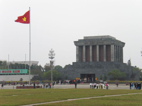 Am Dienstag gings ziemlich frueh morgens aus den Federn - so gegen halb 7 - da wir ja einiges vorhatten um die verlorene Zeit vom Vortag nachzuholen. Nach einem super Fruehstueck im 10. Stock des Hotels mit Blick ueber ganz Hanoi ( Sushi ohne Ende zum Fruehstueck!!!! ) gings dann los auf Streifzug. Sind erstmal in den Ba Dinh District, an vielen alten franzoesischen kolonialen Prachtbauten vorbei und schliesslich zum Ba Dinh Platz. Um diesen Platz gruppieren sich die vietnamesischen Regierungsgebaeude, aber allen voran ragt natuerlich das monumentale Ho Chi Minh Mausoleum hervor, in dem "Onkel Ho" seit Jahrzehnten konserviert und einbalsamiert liegt und auf die Verwirklichung des Kommunismus auf Erden wartet Diesem haben wir dann auf ehrfuerchtige Weise von seiner sozialistischen Ehrengarde begleitet einen kleinen Besuch erstattet. Danach haben wir in der grossen Parkanlage hinter dem Mausoleum noch sein altes Wohnhaus samt Onkel Hos alten Flitzern, seine Bambusstelzenhaus und das Hanoier Wahrzeichen, die beruehmte Einpfahlpagode besichtigt. Danach war es Zeit aus unsrem alten Hotel auszuchecken und im Old Quarter von Hanoi ein neues Quartier fuer unsre letzte Nacht in Hanoi zu suchen. Wir fanden schliesslich eine kleine ruhige Gasse in der Altstadt mit vielen Guesthouses, aber leider waren nicht mehr allzuviele Zimmer frei ... und das Zimmer das wir bekamen, na ja es lag im 4. Stock und war mehr eine mit Wellblech bedeckte Dachterasse als ein Zimmer und hatte das Flair eines Stundenhotels ( ohne Wasser, zeitweise kein Strom ) ... na ja wir dachten fuer 5 euro die Nacht pro Person kann man nicht viel mehr erwarten ( ein ziemlicher Trugschluss wie sich spaeter rausstellte, Zimmerpreise werden in Vietnam pro Zimmer und nicht pro Person angegeben ). Nach einer staerkenden Mahlzeit in einer Garkueche am Strassenrand - lecker Hanoier Nudelsuppe fuer 60 Cent - gings dann weiter ins Getuemmel. Haben uns ganz stilecht mit nem Cyclo zum Literaturtempel in Hanoi kutschieren lassen ... hat schon was wenn man im Zeitlumpentempo durch diesen Wahnsinnsverkehr gleitet ... hier faehrt jeder wirklich so wie es ihm grad passt, es gilt das Recht des Staerkeren. Nach einem gemuetlichen Besuch im Literaturtempel und einem Foto mit Onkel Hos Bruder im Geiste - Lenin-Statue - haben wir noch dem absolut objektiv neutralen und auch gar kein bisschen propagandistisch angehauchtem Hanoier Armeemuseum einen Besuch erstattet. Dort waren allerlei Kriegsreliquien, alte Kriegsmaschinerie, Generalsbuesten, Schlachtplaene, historische Fotos, usw. versammelt. Am beeindruckensten war jedoch die kuriose Sammlung im Hof von amerikanischen Helis, Kampfjets, sowjetischen Panzern und Haubitzen (auf denen wir etwas darum geturnt sind) und als Hoehepunkt ein riesiger Schrotthaufen von B 52 Bomberteilen in der Mitte. Kurz bevor es dunkel wurde haben wir dann noch den Jadebergtempel ( dort ist eine 250 Kg Schildkroete, die Ende der 60er aus dem See gefischt wurde, ausgestellt! ) auf dem Hoan Kiem See im Zentrum vom Old Quarter. Nach dem Abendessen in einem kleinen Restaurant, sind wir dann ins "Bobby Chinh Cafe" - einem von einem Australier gefuehrter Nobelschuppen, im Stil von 1001 Nacht gehalten (riesige bequem Sitzecken, edelster Marmor, riesige rote Vorhaenge und Lampions und alles in ein angenehmes Licht getaucht) ... der Hauptgrund fuer unseren Besuch war, dass es dort exzellente Wasserpfeifen gab, wirklich 1 A! Der Laden scheint auch ziemlich beruehmt zu sein, an den Waenden waren viele Bilder vom Besitzer mit Prominenz wie Hillary Clinton, die hier schon mal zur Stippvisite waren. Irgendwann mussten wir dann jedoch zurueck aus dem Paradies in die graue Realitaet unseres "Fucking Shit Guesthouses" ... unterwegs haben wir noch was krasses zu sehen bekommen: Hunderte von Vietnamesen waren auf den Strassen unterwegs, die alle weisse Overalls mit riesiger roter "Jesus"-Beschriftung und Santa Claus Muetzen trugen und Israel Fahnen schwangen - anscheinend feiern so die vietnamesischen Christen in Weihnachten rein - hatte auf jeden Fall was komisches an sich