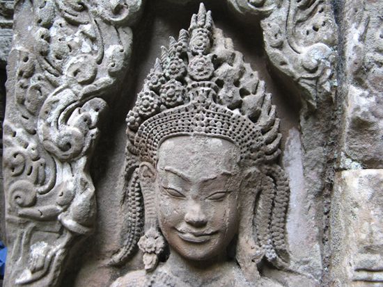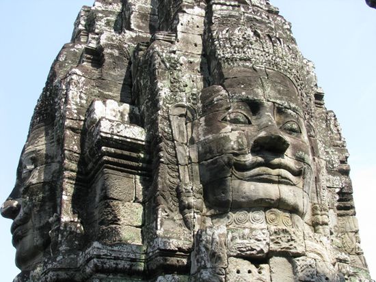 Danach ging es zum Bayon-Tempel, von dem aus ueber 200 Gesichter auf jeden Besucher herabblicken. Die Anlage war sehr viel kleiner als Angkor Wat, wir fanden auf dem begrenzten Raum aber auch sehr viele Motive zum Forografieren. Und wieder ueberraschten uns die steilen Treppen, die ueberall eingemeisselten Ornamente und die Hoehe der mehr oder weniger einfach aufeinander gestellten Steine...