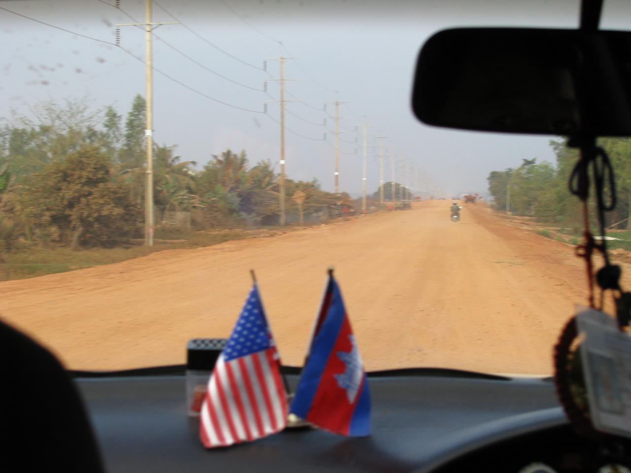 Unser Driver flog mit 80 bis 90 Sachen ueber die Schotterpiste, die in der Umgebung von Siem Reap noch geteert ist, bis 12 Kilometer vor Sisophon aber nur aus einer staubigen, steinigen Staub- und Schotterpiste besteht, auf der viel zu viele Verrueckte und ueberladene Vehikel mit viel zu hoher Geschwindigkeit unterwegs sind. Waehrend ueberall Baumaschinen verzweifelt versuchen, die Oberflaeche der Pist fuer die irgendwann kommende Teerdecke gerade zu halten.