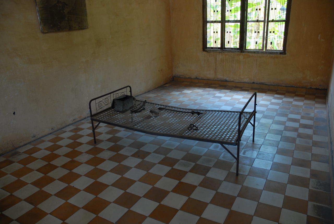 Einzelzelle in dem Gebaeudekomplex. Mit den Eisenhaken und der Stange wurde der Gefangene ans Bett gefesselt