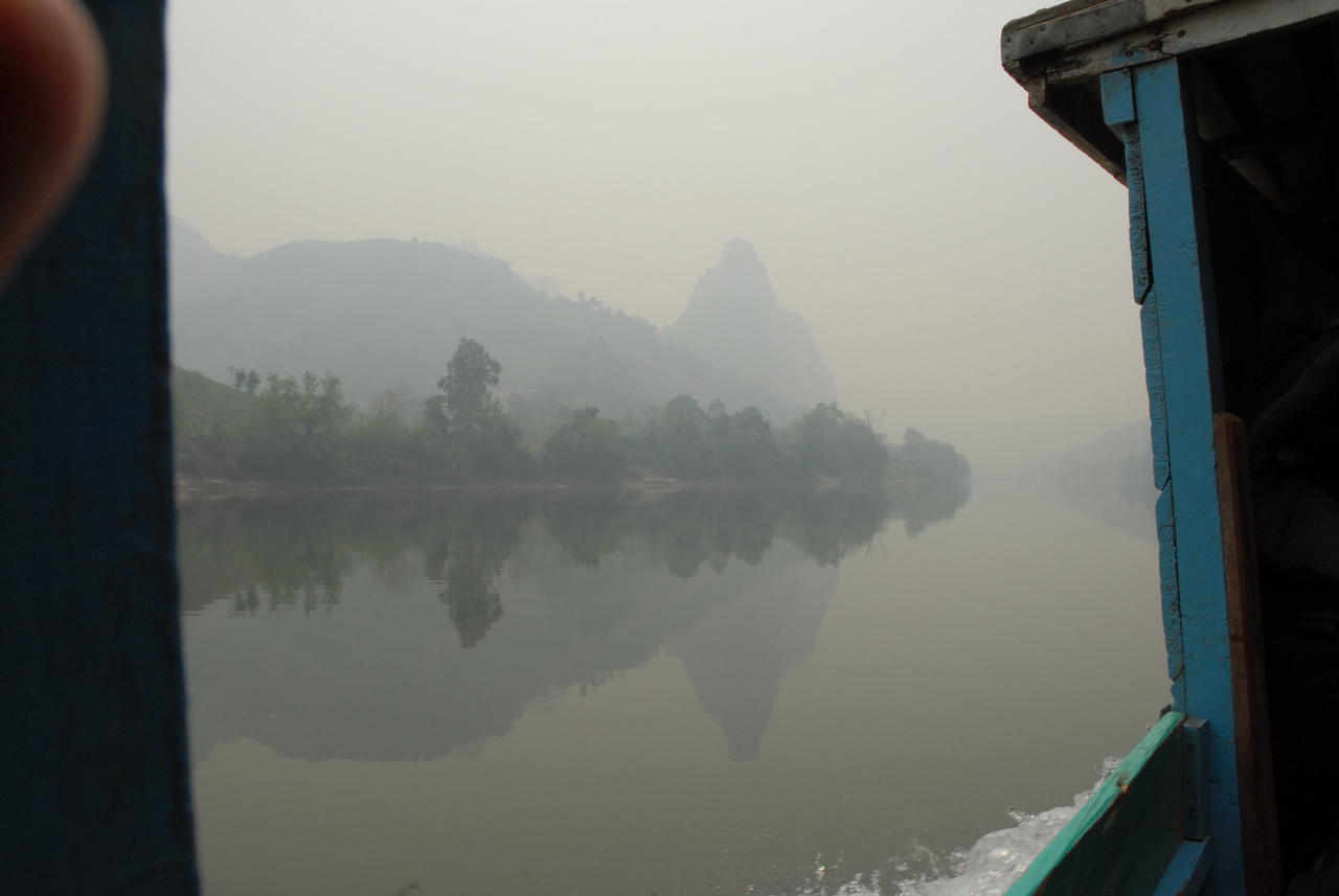 Leider hatte es auch ier wie auf der ganzen Fahrtstrecke erheblichen Dunst, so dass die schoene Landschaft nicht allzu gut zu sehen war. Zurueckzufuehren ist das Ganze auf die Brandrodung ganzer Landstriche, mit der die Laoten nach einem uns unerklaerlichen System die Boeden wieder fruchtbar machen wollen. Da lodern hunderte von Feuern in der ganzen Gegend. Und diese produzieren so viel Rauch und Smog, dass man die Sonne am Himmel oftmals nicht mehr sieht.