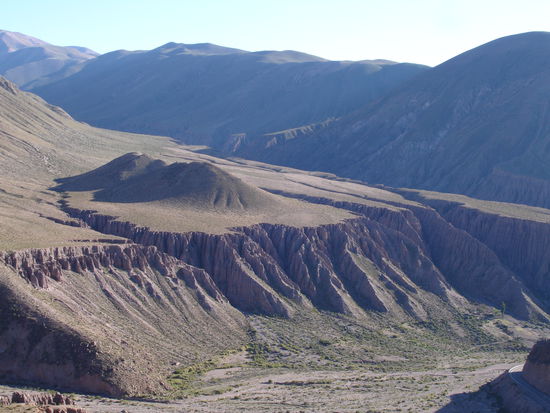 Nach Jujuy geht das Tal auf, die Strasse wird breiter. Es geht stark aufwärts. Wir kommen in die Quebrada de Humahuaca, steile Felsen und wieder traumhafte Farben und Formen begleiten uns.